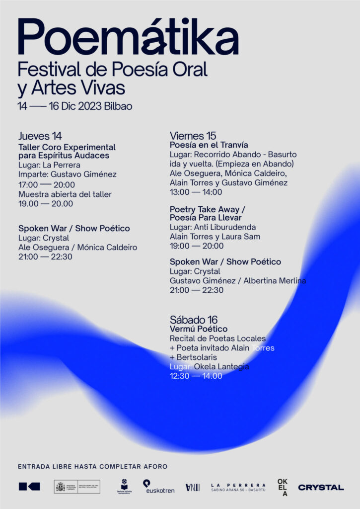 La segunda edición de Poemátika, el Primer Festival de Poesía Oral de Bilbao, llega a la ciudad para despedir el año con una variada programación los días 14, 15 y 16 de diciembre, acogiendo desde talleres, shows de poesía oral en directo, recitales de poesía en el tranvía, hasta una sesión de «Poetry Take Away», en la que el público podrá encargar poemas para llevar. El Festival (sucesor de Spoken Word Bilbao) que en 2022 celebró su primera edición dentro de la programación de Gutun Zuria, se consolida este año repartiendo su programación por diferentes salas, librerías, y espacios de arte de Bilbao. Poetas de Barcelona, Madrid, Zaragoza y Euskadi formarán parte de esta interesante propuesta apoyada por la Fundación Industrias Creativas.